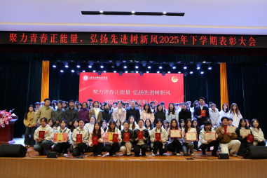 为弘扬青春正能量,凝聚校园奋斗力量,营造积极向上、奋勇争先的良好氛围,近日,学校团委 2025 年下学期表彰大会在三栋一楼多功能厅隆重召开。学生工作处副处长、校团委书记尹艳华,校团委副书记夏涵艺,各二级学院团总支书记及师生代表齐聚一堂,共同见证这份属于青春的荣耀时刻,大会由夏亮同学主持。
