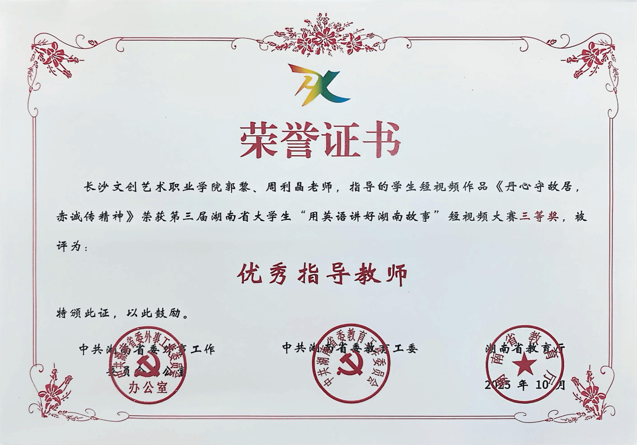近日,由中共湖南省委外事工作委员会办公室、中共湖南省委教育工委、湖南省教育厅联合主办的第三届湖南省大学生 “用英语讲好湖南故事” 短视频大赛获奖名单正式揭晓。由我校郭黎、周利晶老师指导的学生团队(张颖、刘小督、石倚瑄、王子涵、唐柯)配音及创作的短视频作品《丹心守故居,赤诚传精神》在全省高职高专组激烈角逐中脱颖而出,成功斩获省级三等奖。