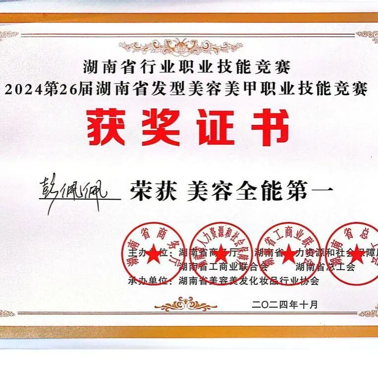 获得荣誉:湖南省第26届发型美容美甲技能竞赛美容全能第一、第五届全国美发美容行业职业技能竞赛美容赛项三等奖、第二届湖南省职业技能大赛美容赛项第五名、湖南省第27届发型美容美甲技能竞赛形象设计全能第一。