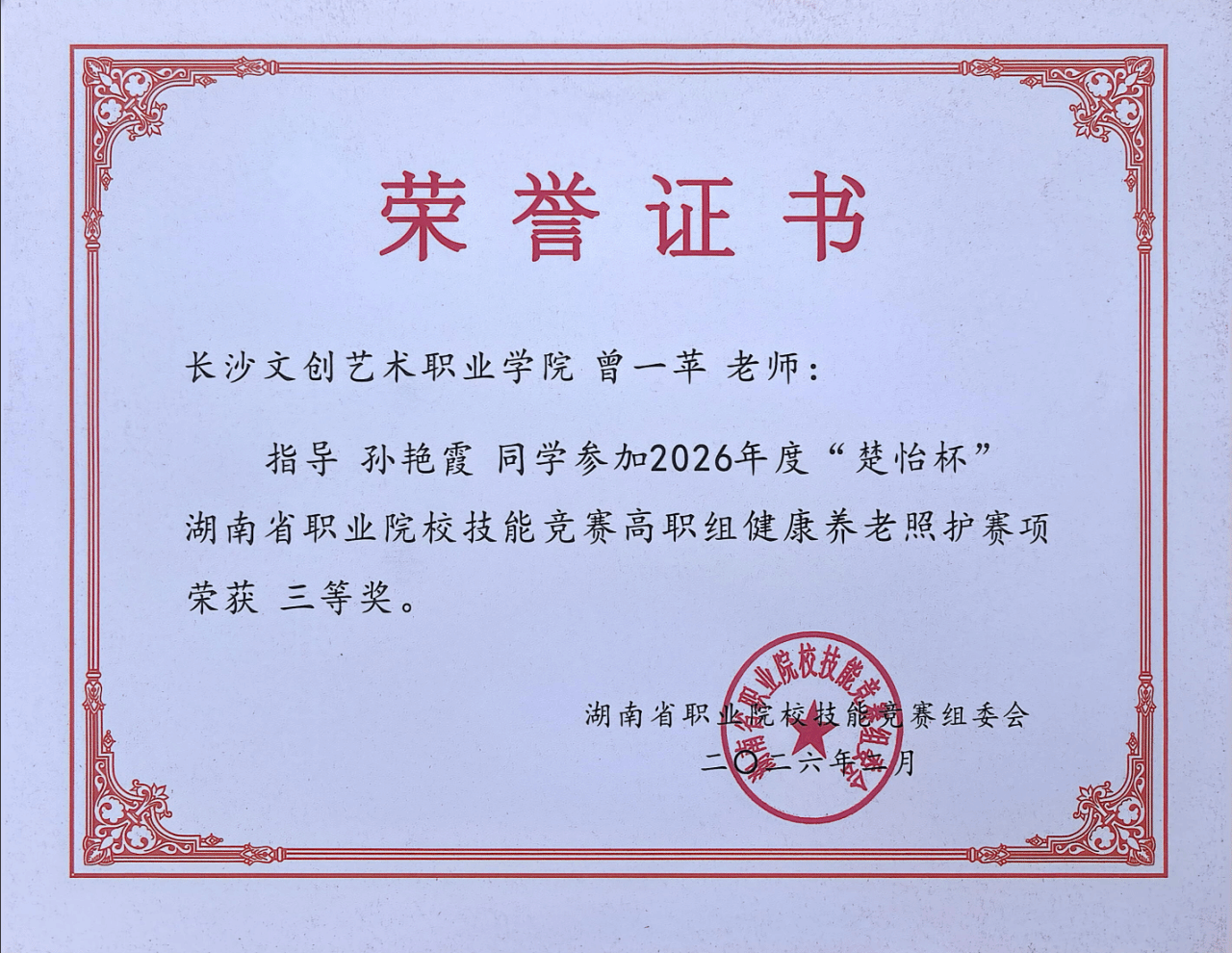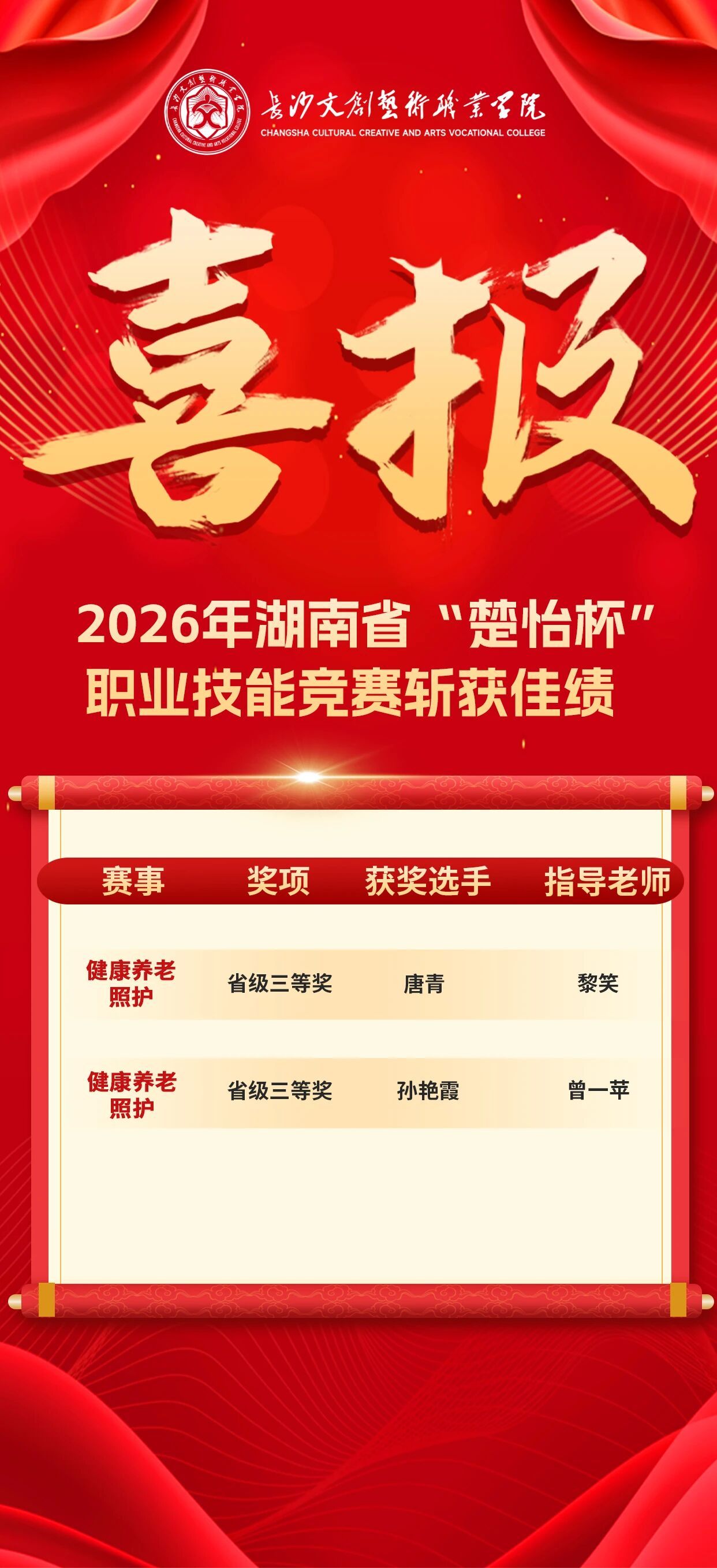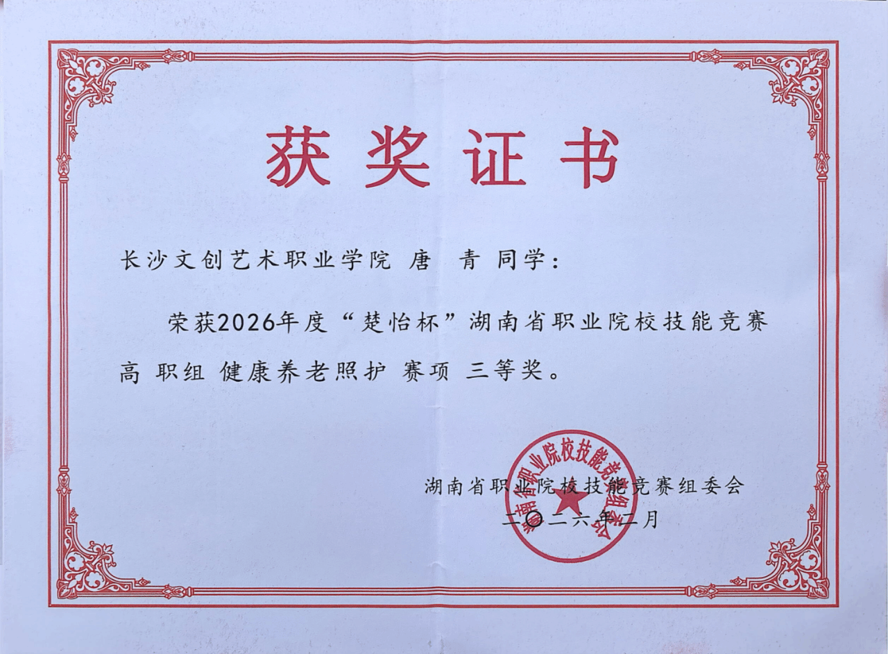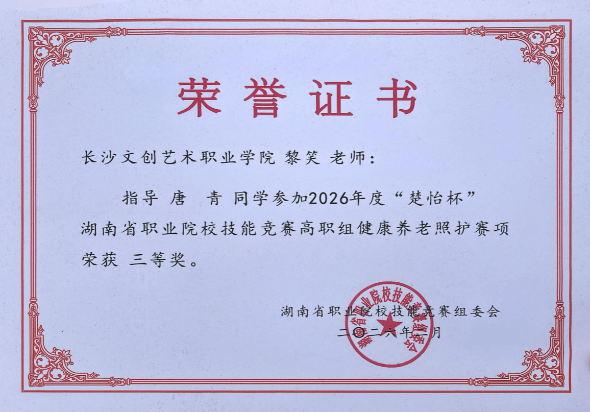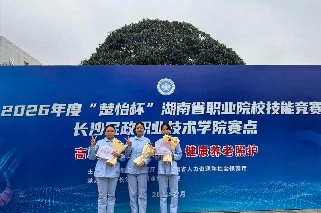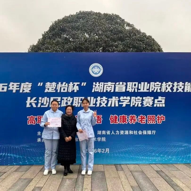 近日,在由湖南省教育厅、湖南省人力资源和社会保障厅主办的2026年 “楚怡杯”湖南省职业院校技能竞赛中,我校健康护理学院黎笑、曾一苹老师指导的唐青、孙艳霞同学,在健康养老照护赛项荣获省级三等奖!