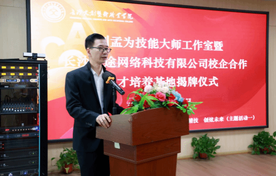 长沙弘途网络科技有限公司董事长吴北军随后发言,对合作前景充满期待:“我们公司与学院合作,不仅只是建立一个实训基地,更希望能与技能大师工作室共同搭建一个集项目实践、技术创新于一体的育人平台,让学生在校期间就能积累实战经验,毕业即成为‘熟练工’,适应企业需求。”