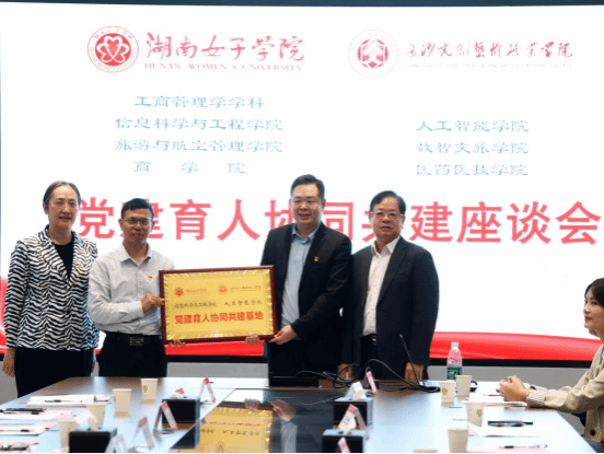 在全体与会人员见证下,“党建育人协同共建基地” 揭牌仪式庄严举行。本次共建聚焦二级学院精准对接,成立三个共建基地,分别为:湖南女子学院信息科学与工程学院与我校人工智能学院、旅游与航空管理学院与我校数智文旅学院、商学院与我校医药医技学院。此举标志着两校党建共建与协同育人向基层教学单位深入推进,构建了以党建引领、专业为纽带、院系为主体的协同育人新格局,为双方合作开启以点带面、深度融合的新篇章。