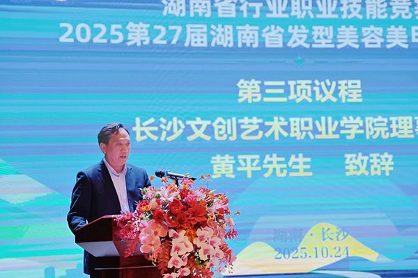 竞赛承办执行单位、长沙文创艺术职业学院理事长黄平在欢迎辞中强调,本次竞赛为全省的美业技能人才搭建了“以赛促学、以赛促练、以赛促创”的交流平台,有力推动了湖南美业标准化建设与技艺水平提升。长沙文创职院将以“文化+科技”为办学特色,持续深化产教融合,为行业输送复合型技术技能人才。学校将进一步推进“赛教融合”,把竞赛标准融入日常教学,助力湖南美业人才梯队建设。