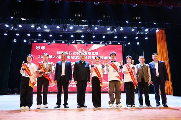 10月24日至25日,由湖南省商务厅、湖南省人力资源和社会保障厅、湖南省工商业联合会、湖南省总工会联合主办,湖南省美容美发化妆品行业协会承办,长沙文创艺术职业学院承办执行的第27届湖南省发型美容美甲技能竞赛在长沙文创艺术职业学院顺利举行。湖南省教育厅副厅长王仁祥,国家教育咨询委员会委员、省人民政府原党组成员、教育顾问、省教育厅原厅长、湖南省民办教育协会会长张放平,湖南省商务厅二级巡视员周章生,湖南省商务厅服贸处一级调研员潘繁荣,湖南省商务厅行业党委副书记周久虎,湖南省人社厅职建处二级调研员羊国杰,湖南省工商联商会部部长张帆,湖南省总工会技协办二级调研员邹红梅,长沙市教育局副局长杨庆江,长沙市教育局高教处长范霖,宁乡市副市长段志斌,湖南省美容美发化妆品行业协会会长刘勇,湖南工艺美术职业学院副校长张华,长沙财经学校校长伍卓林,万婴教育集团董事长、长沙文创艺术职业学院理事长黄平等领导嘉宾出席开幕式。来自全省14个市州的千余名美业从业者及院校师生齐聚一堂,围绕美容、美发、美甲、形象设计四大职业赛项展开激烈角逐,共同呈现了一场高水平的技能盛会。