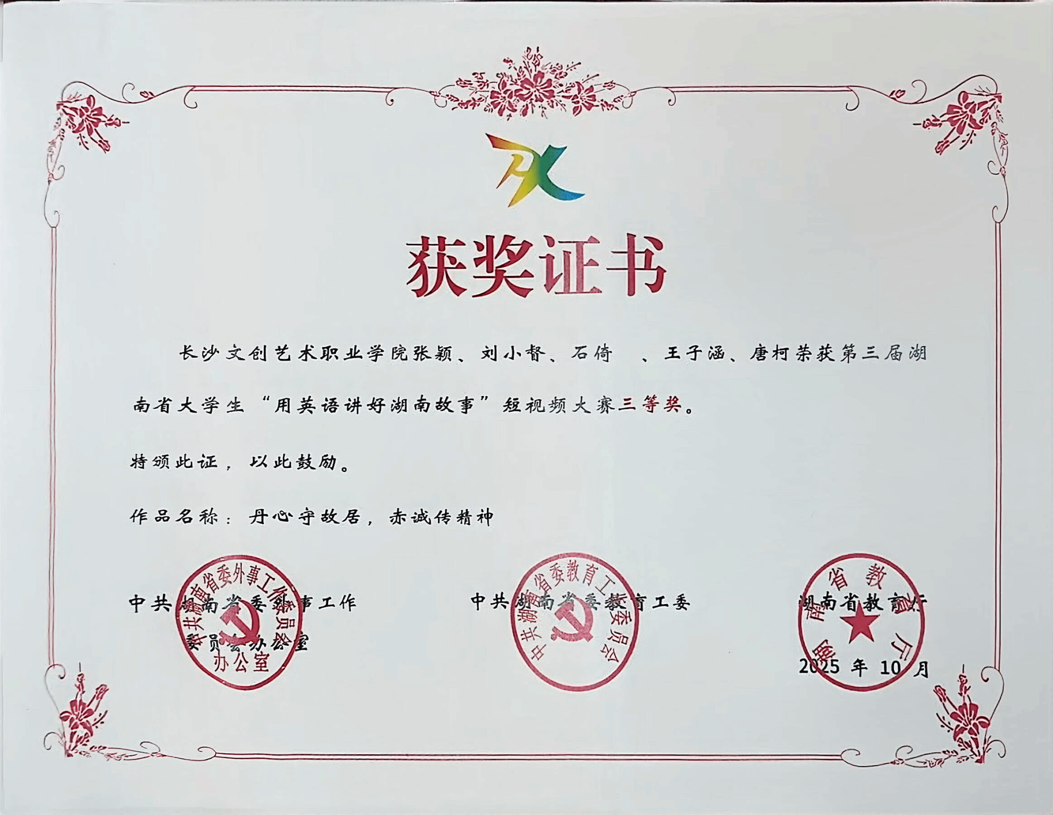 近日,由中共湖南省委外事工作委员会办公室、中共湖南省委教育工委、湖南省教育厅联合主办的第三届湖南省大学生 “用英语讲好湖南故事” 短视频大赛获奖名单正式揭晓。由我校郭黎、周利晶老师指导的学生团队(张颖、刘小督、石倚瑄、王子涵、唐柯)配音及创作的短视频作品《丹心守故居,赤诚传精神》在全省高职高专组激烈角逐中脱颖而出,成功斩获省级三等奖。
