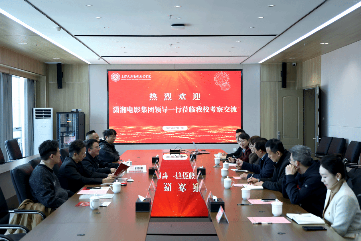 在随后举行的座谈会上,黄平理事长代表学校对潇湘电影集团的到访表示热烈欢迎。双方围绕我校思政教育基地建设、校内电影院建设、“潇湘电影学院”共建、直播电商合作以及学校文创IP开发等项目进行了深入交流与探讨。双方达成共识,计划在我校打造一座全省乃至全国高校首家实现与商业院线同步上映的LED数字电影院,助力我校品牌建设从长沙文创走向全国文创,积极融入中国文创产业发展大潮。