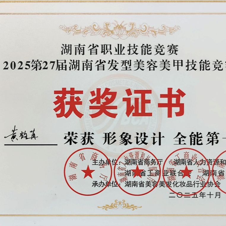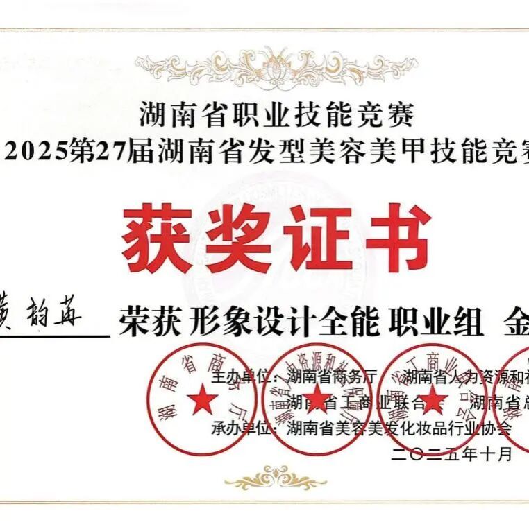 获得荣誉:湖南省第26届发型美容美甲技能竞赛美容全能第一、第五届全国美发美容行业职业技能竞赛美容赛项三等奖、第二届湖南省职业技能大赛美容赛项第五名、湖南省第27届发型美容美甲技能竞赛形象设计全能第一。