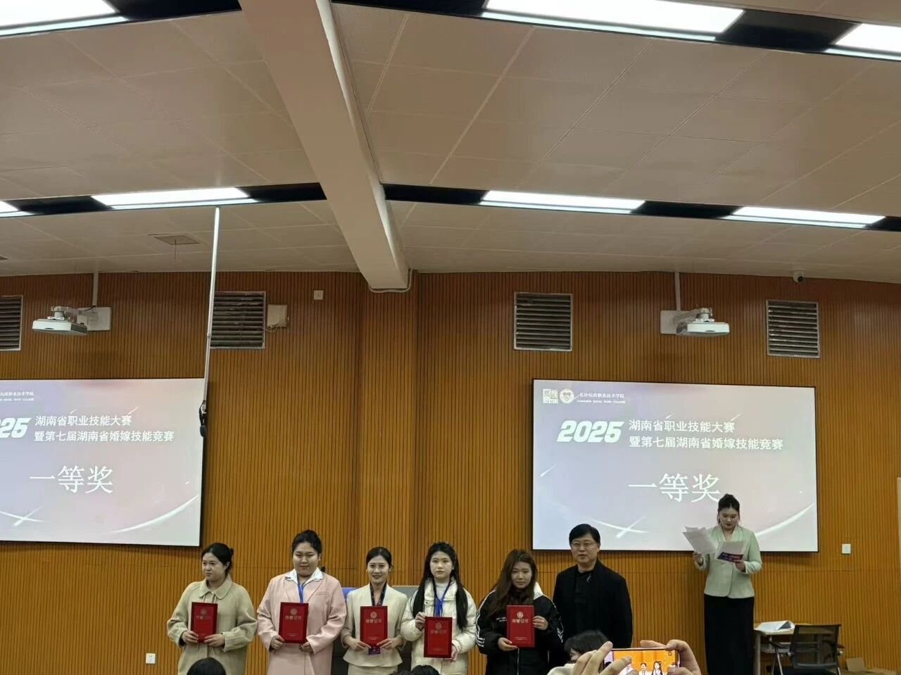 所获荣誉:第七届湖南省婚嫁技能竞赛中,数智文旅学院郭思慧同学斩获主持组一等奖、张伟同学荣获策划组三等奖。