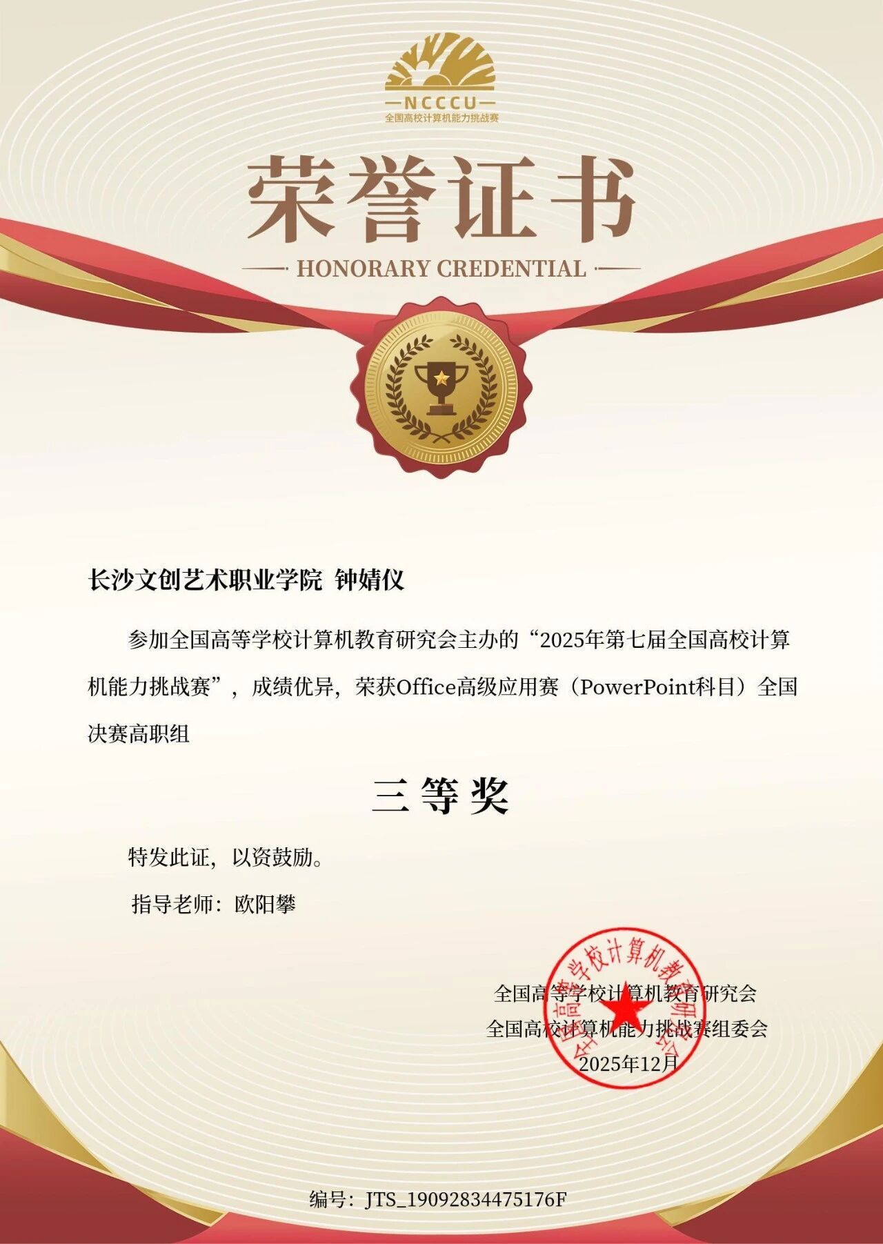 2025年第二届“金砖国家技能发展与技术创新大赛”人工智能算法应用设计赛全国总决赛国赛三等奖;2025年全国计算机挑战赛国赛三等奖两项、省赛一二三等奖共计二十余项;2025年蓝桥杯省赛二等奖两项、三等奖三项;2024年全国计算机挑战赛省赛三等奖五项。