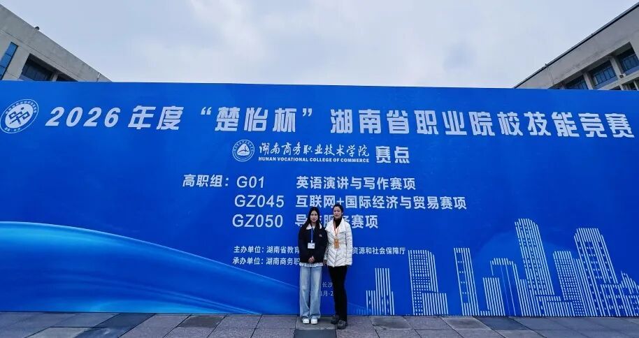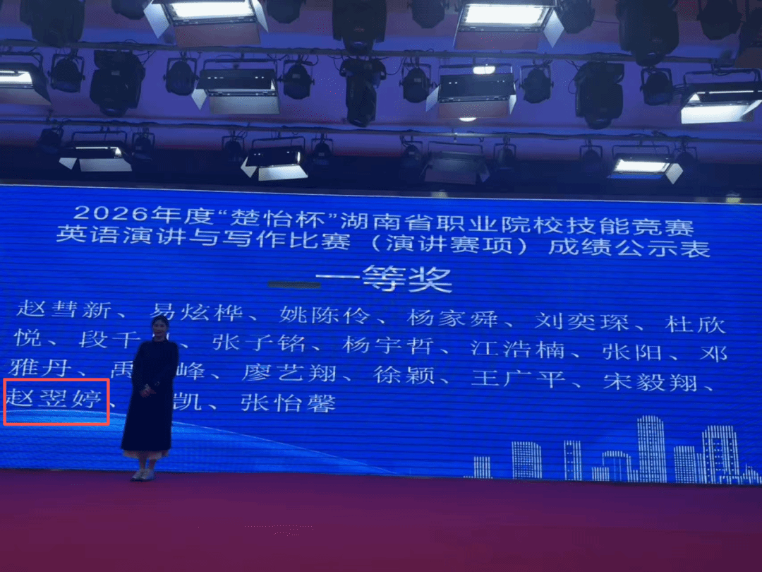 今日,由湖南省教育厅、湖南省人力资源和社会保障厅主办的2026年度湖南省“楚怡杯”职业技能竞赛(英语演讲与写作赛项)圆满落幕。在演讲赛项(个人赛)赛场,全省 200 余名参赛选手同台竞技、比拼风采,历经两天的激烈角逐,我校学子斩获佳绩——由吴欣怡老师指导的赵翌婷同学荣获一等奖、由郭黎老师指导的张颖同学荣获三等奖!