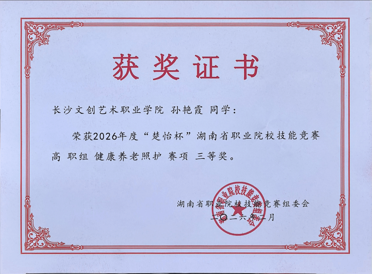 近日,在由湖南省教育厅、湖南省人力资源和社会保障厅主办的2026年 “楚怡杯”湖南省职业院校技能竞赛中,我校健康护理学院黎笑、曾一苹老师指导的唐青、孙艳霞同学,在健康养老照护赛项荣获省级三等奖!