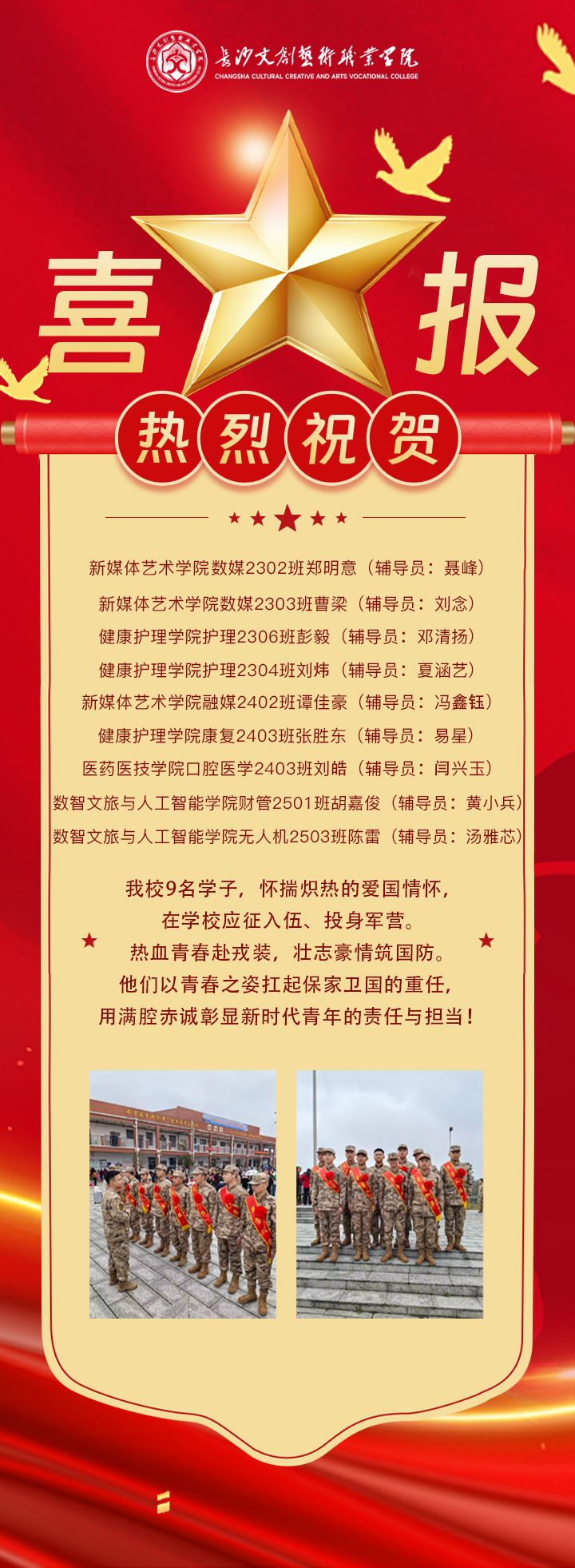 近日,我校曹梁、张胜东、刘炜、彭毅、刘皓、郑明意、胡佳俊、陈雷、谭佳豪9名学子,怀揣炽热的爱国情怀,在学校应征入伍、投身军营。