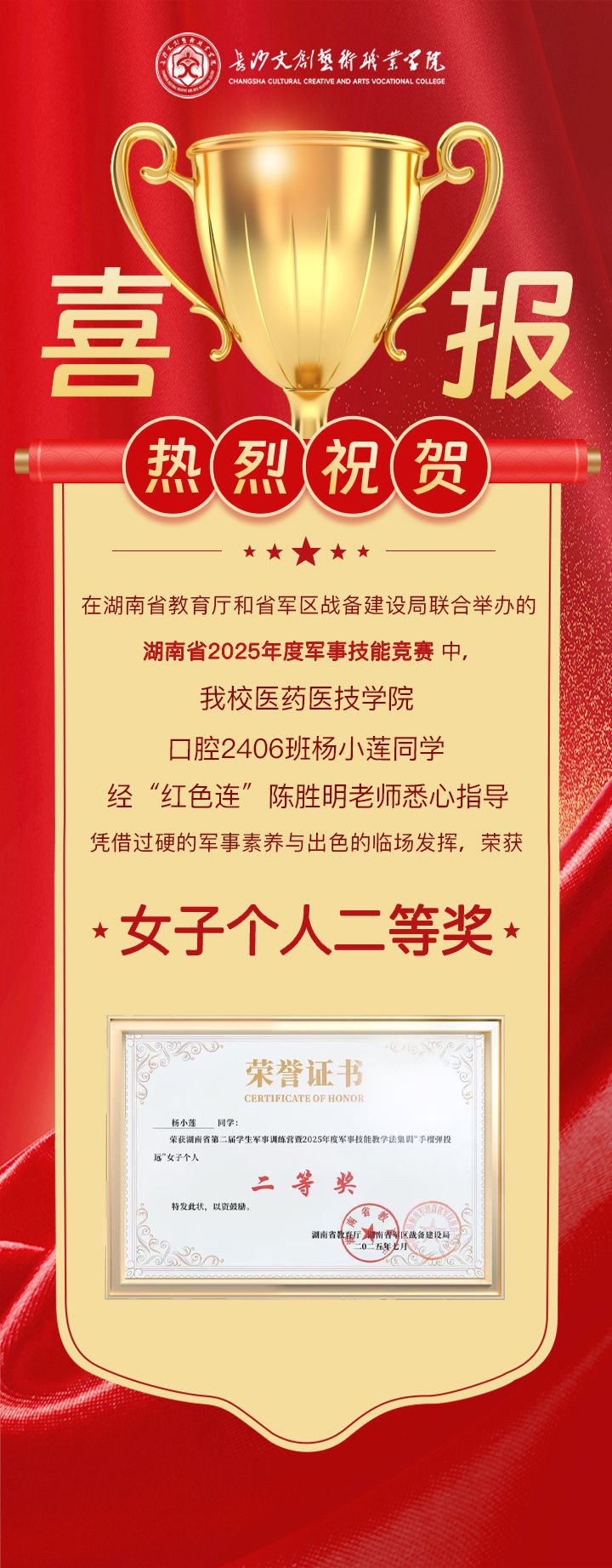 近日,在湖南省教育厅和省军区战备建设局联合举办的湖南省2025年度军事技能竞赛中,我校医药医技学院口腔2406班杨小莲同学,经“红色连”陈胜明老师悉心指导,凭借过硬的军事素养与出色的临场发挥,荣获女子个人二等奖!