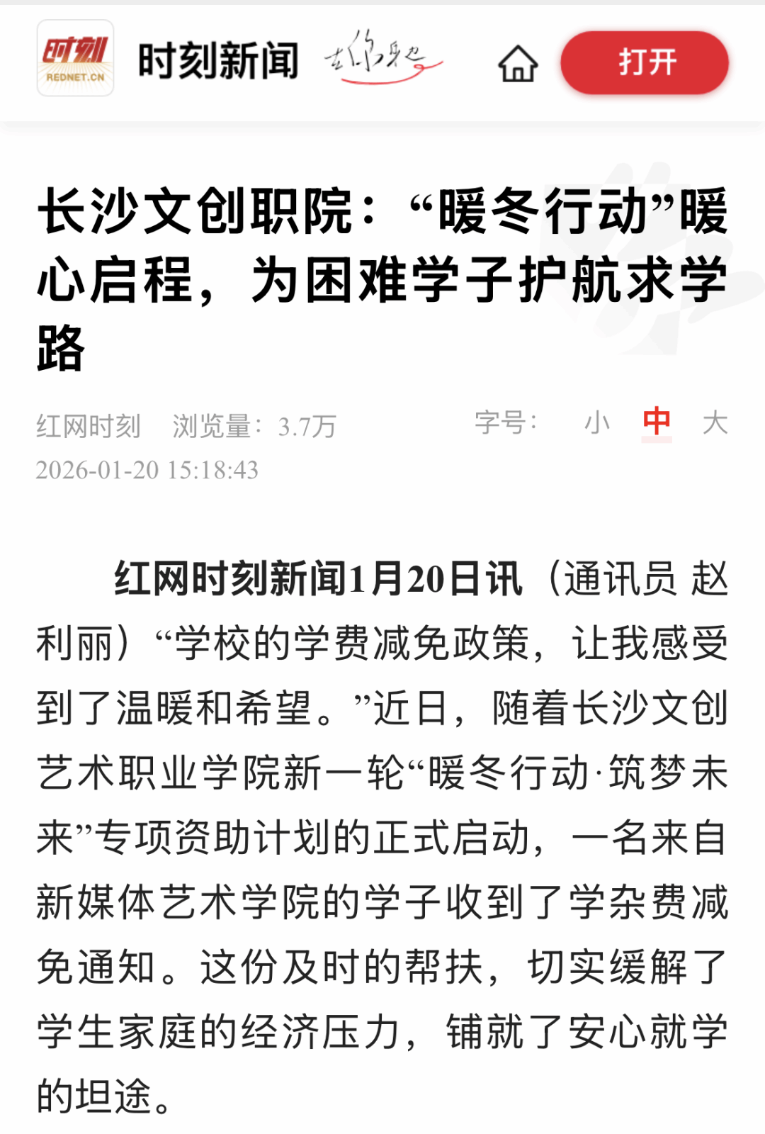“学校的学费减免政策,让我感受到了温暖和希望。”近日,随着长沙文创艺术职业学院新一轮“暖冬行动·筑梦未来”专项资助计划的正式启动,一名来自新媒体艺术学院的学子表示收到了学杂费减免通知。这份及时的帮扶,切实缓解了学生家庭的经济压力,铺就了安心就学的坦途。