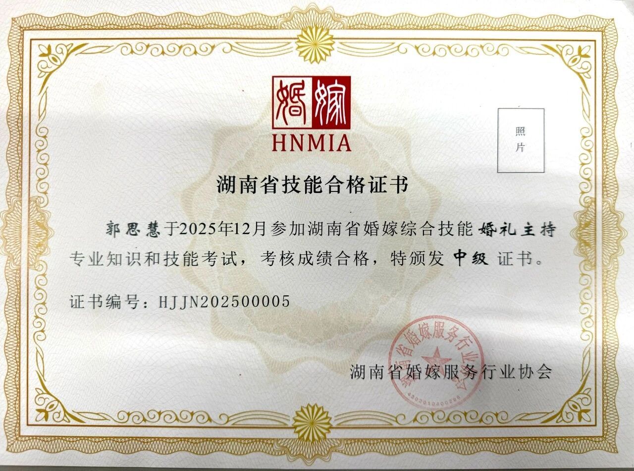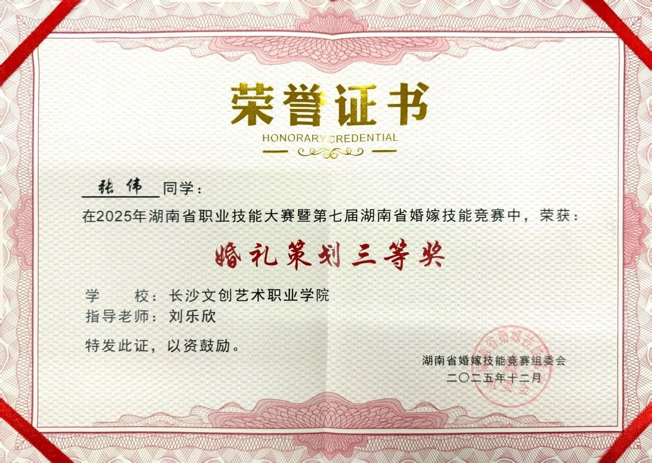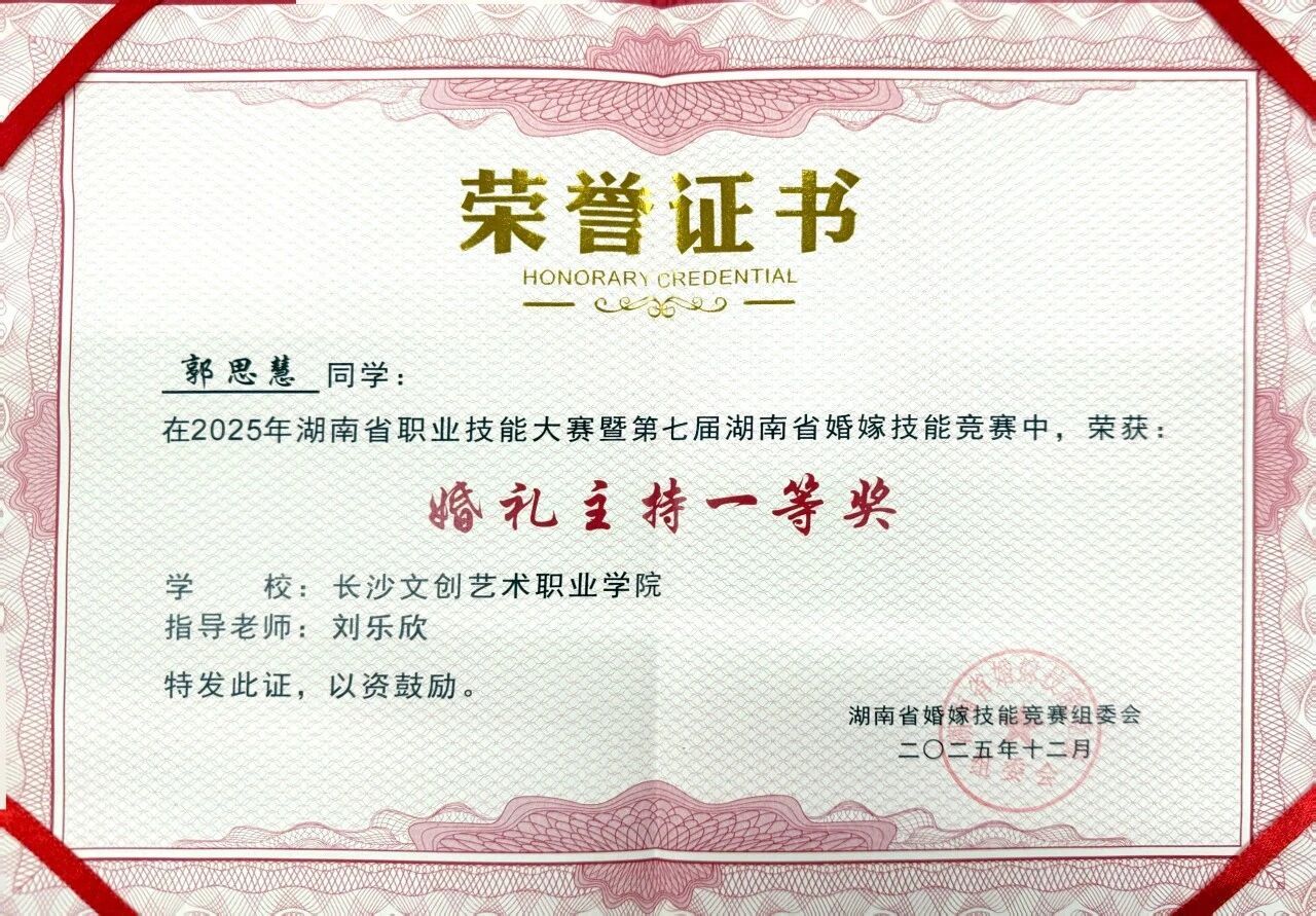 所获荣誉:第七届湖南省婚嫁技能竞赛中,数智文旅学院郭思慧同学斩获主持组一等奖、张伟同学荣获策划组三等奖。