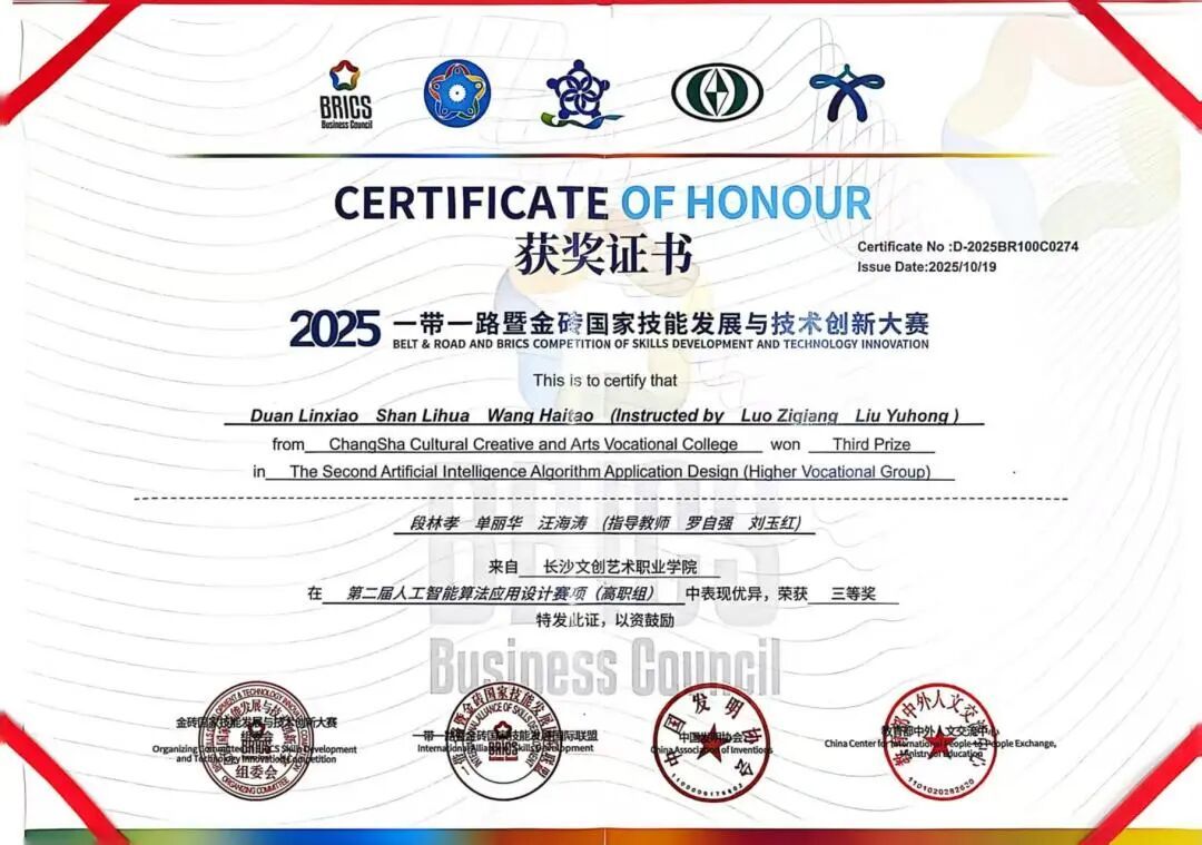 2025年第二届“金砖国家技能发展与技术创新大赛”人工智能算法应用设计赛全国总决赛国赛三等奖;2025年全国计算机挑战赛国赛三等奖两项、省赛一二三等奖共计二十余项;2025年蓝桥杯省赛二等奖两项、三等奖三项;2024年全国计算机挑战赛省赛三等奖五项。